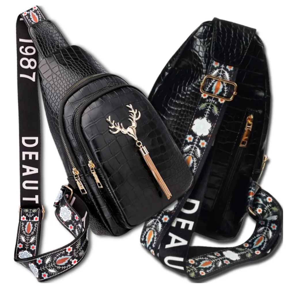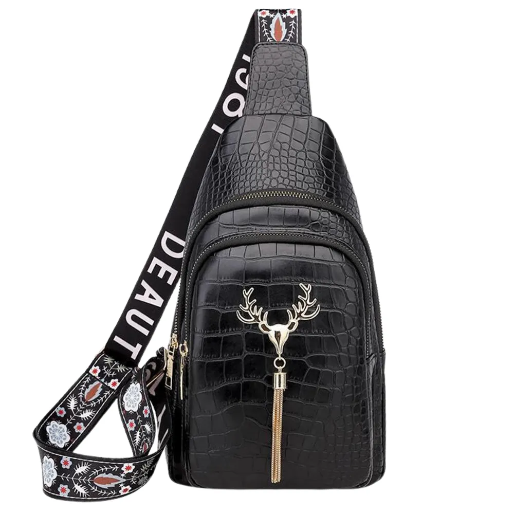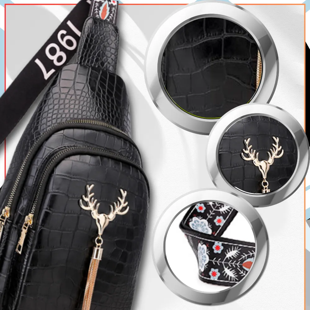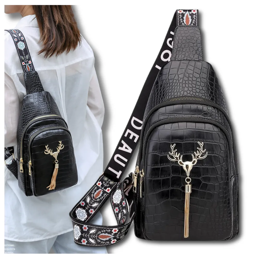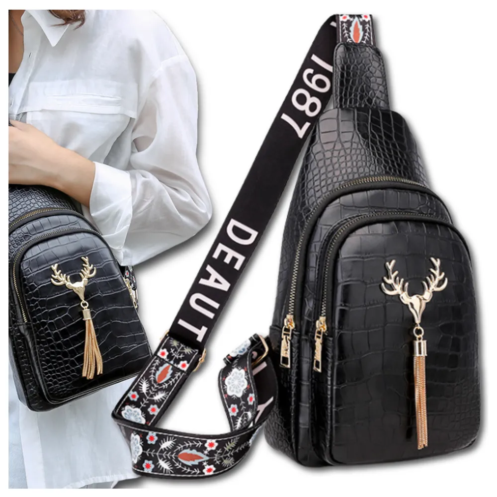 Produkt ten został wykonany bardzo starannie, z dbałością o takie szczegóły, jak na przykład oryginalna ozdoba na jego przodzie w postaci głowy jelenia i wisiorka ze złotych łańcuszków. Uroku dodaje mu także błyszcząca faktura czarnej, ekologicznej skóry, z której jest zrobiony, imitującej kosztowną skórę krokodylą.