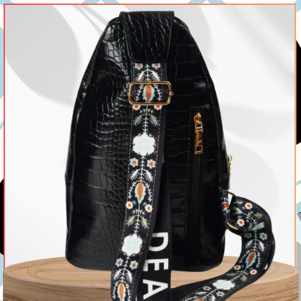 Ponadto uwagę zwraca szeroki pasek do noszenia na ramieniu, na którym znajdują się skandynawskie wzory kwiatowe, a także białe napisy na czarnym tle. Pasek jest regulowany w długości, może być więc wygodnie dopasowany do potrzeb użytkowniczki wyrobu, jakim jest plecak na ramie torba saszetka damska eko skóra.