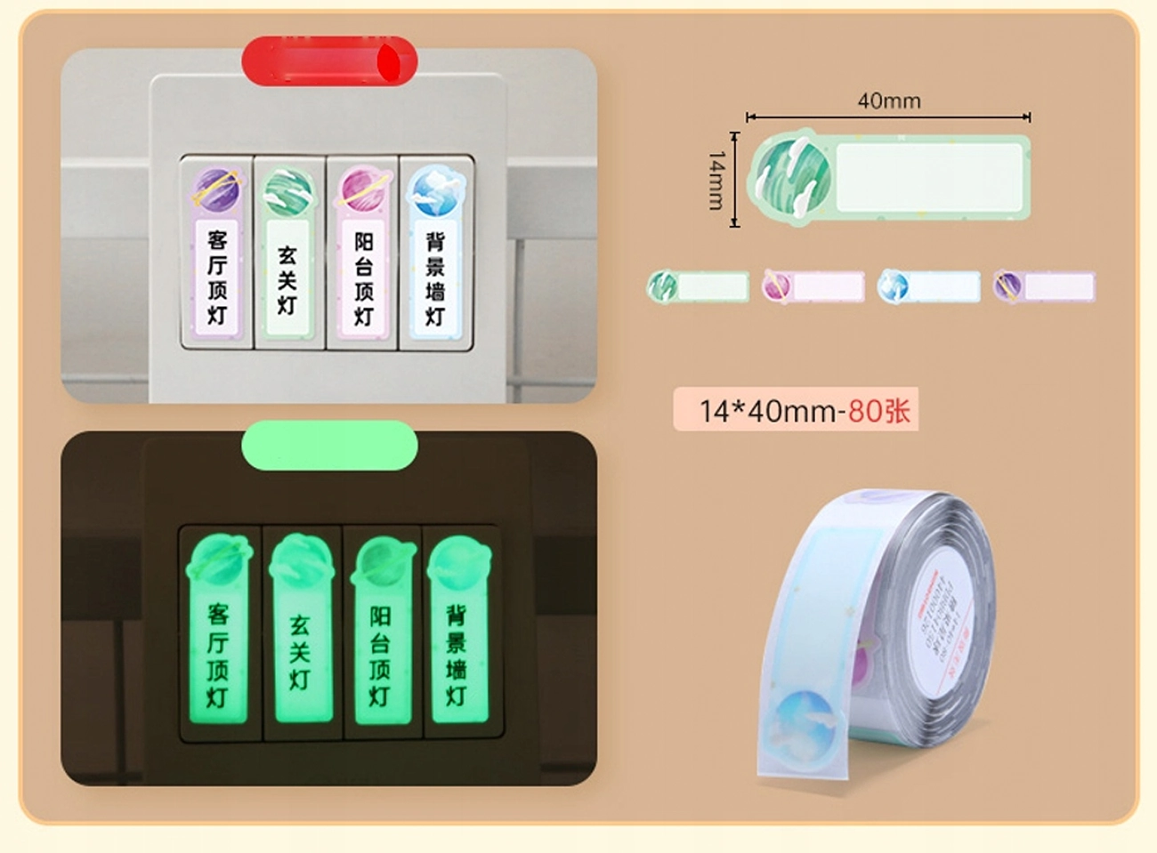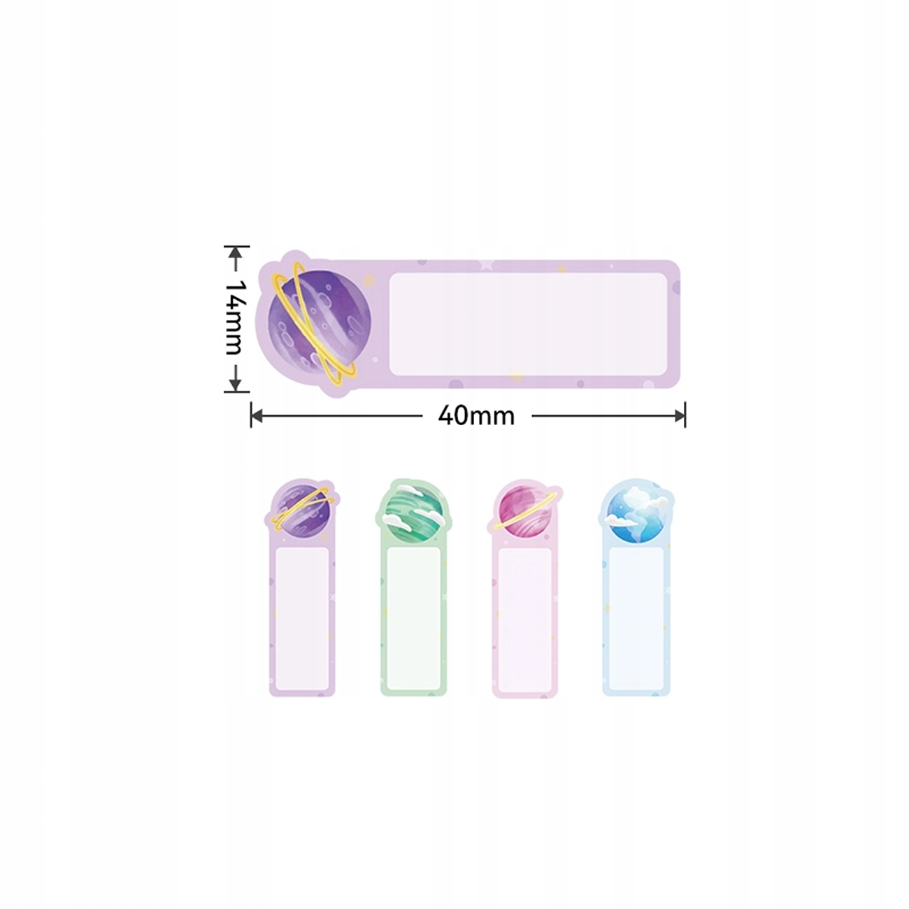 Tutaj sprzedajemy 1 rolkę o rozmiarze etykiet termicznych 14x40mm PLANETY ŚWIECĄCE W CIEMNOŚCI 160 naklejek do drukarek Niimbot seria D