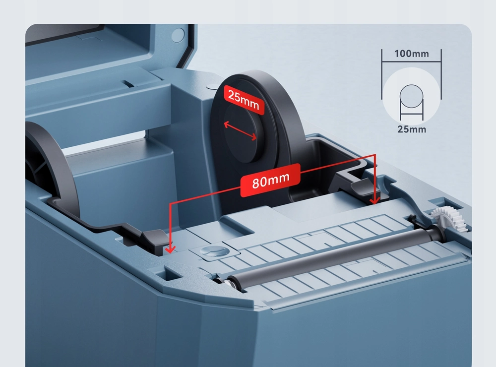 Drukarka obsługuje szerokości etykiet od 20 do 80 mm, a startowa rolka to aż 900 etykiet o wymiarach 50x30 mm. Możesz drukować na etykietach klasycznych, przezroczystych, czarnych, wysyłkowych, a także z użyciem znaczników. To doskonałe rozwiązanie dla branży logistycznej, odzieżowej, spożywczej i jubilerskiej.