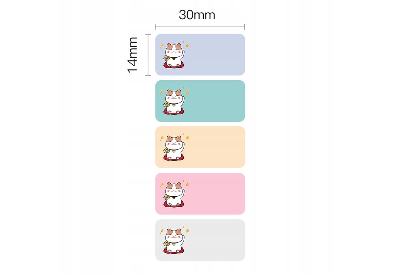 Kupujesz 1 rolkę etykiet termicznych 14x30 mm w wyjątkowym wzorze CUTE1 – kolorowe naklejki w urocze kotki. Rolka zawiera aż 210 samoprzylepnych etykiet, które idealnie pasują do drukarek marki Niimbot z serii D (D11, D110, D101).
